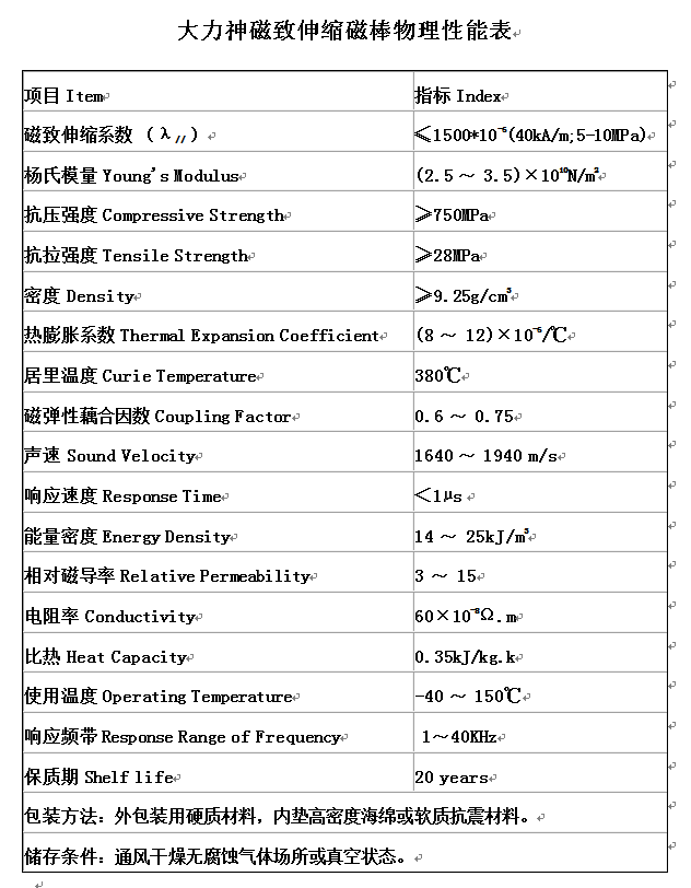 性能及优点:性能稳定、磁致伸缩转换效率高,伸缩率及输出能量大,即时响应无滞后,强度高不易碎裂,制作振动音响时音域宽广、音色优美。
